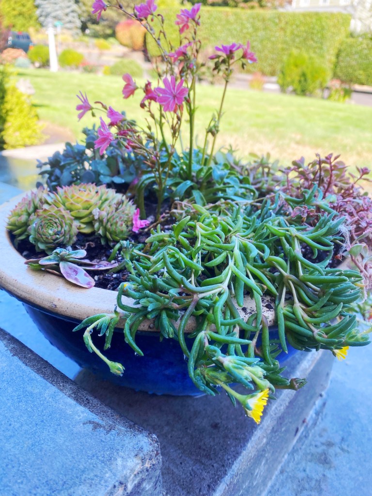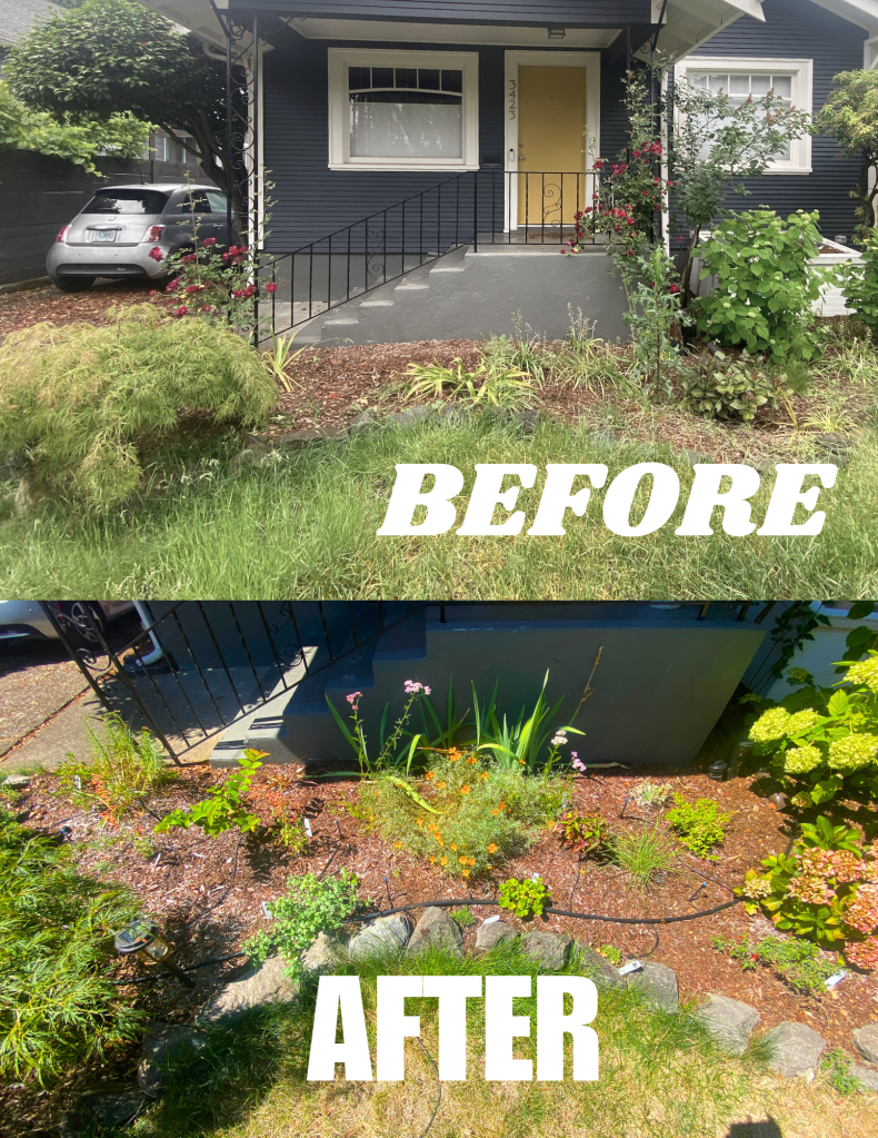 In her front yard a few plants she loved were kept (small Japanese maple, California poppies & hydrangeas) and I created a colorful sunset palette of drought-tolerant, pollinator attractors to match the poppies which were blooming in the middle of the bed at the time. I kept the front bed mostly native plants with lots of bright colors from ice plants, apricot agastache, pink yarrow, and fuchsias.