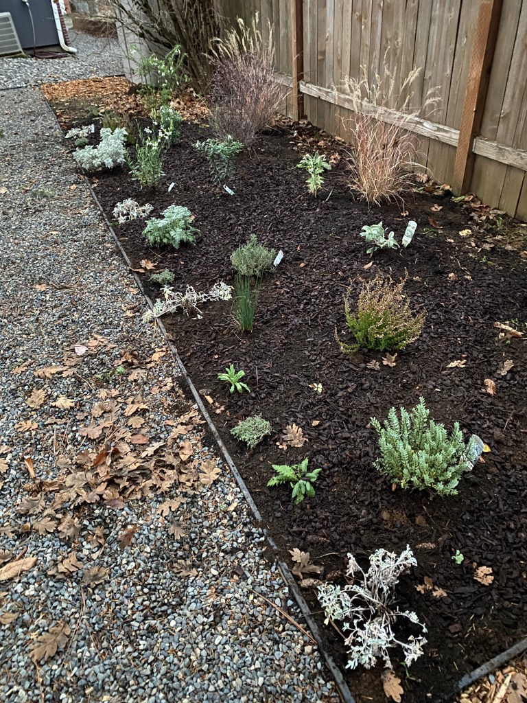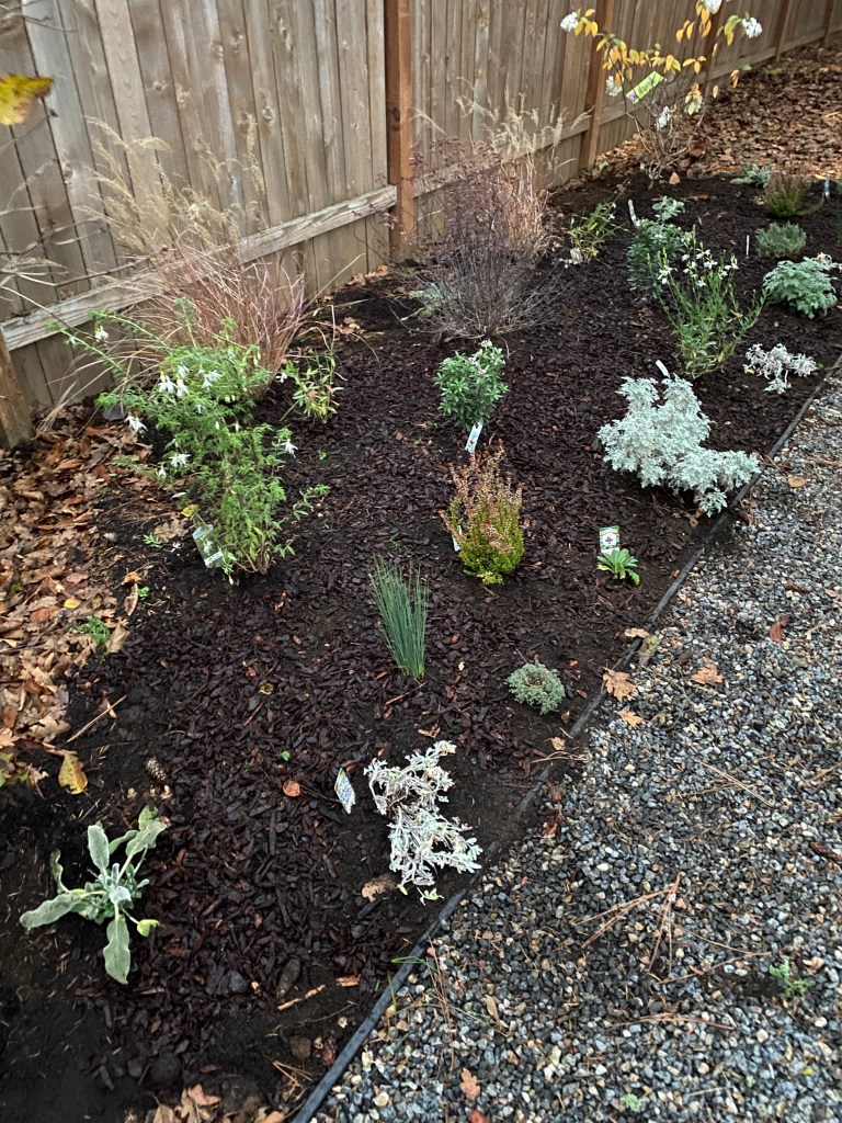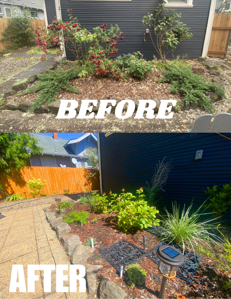 On the opposite side, the bed against her house, tall and gangly red roses and sprawling junipers. She didn’t particularly like any of the plants in this bed, so we decided together to start fresh! I brought in a mixture of native plants & hardy drought-tolerant beauties with dark purple & white flowers. Taller shrubs in the back, graduating to smaller perennials, and finally smaller ground cover plants to spill out over the rocks in the front.